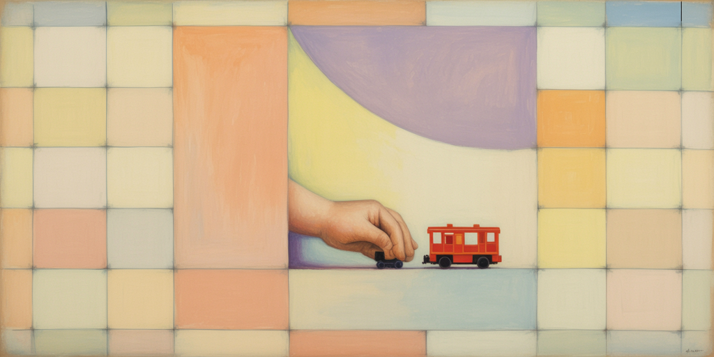 Within many geometric compositions, small shapes hint at toys. Wheels, blocks, strings of beads. They are not drawn fully—only suggested. The viewer must search as a child does, with wonder and patience.