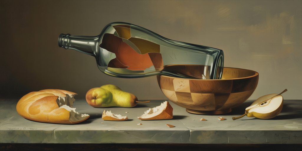 This delay of consumption transforms the scene. It is not a celebration, but a meditation. The absence of wine makes the bottle a reliquary of past joy, past communion.