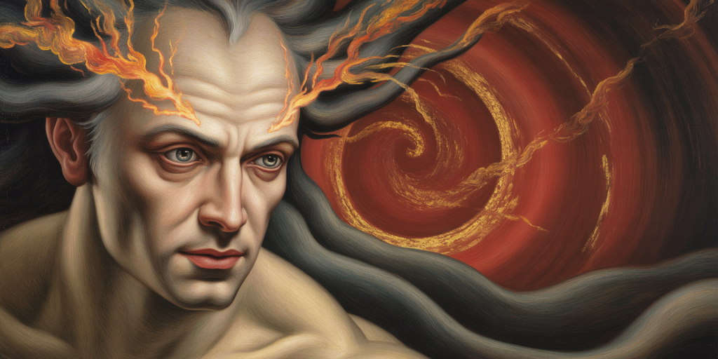 The composition is elemental: spirals of flame encase the godhead, curling like solar flares around his muscled form. This is not anatomy but apocalypse. His hair flows like lava. His breath ignites the dark.