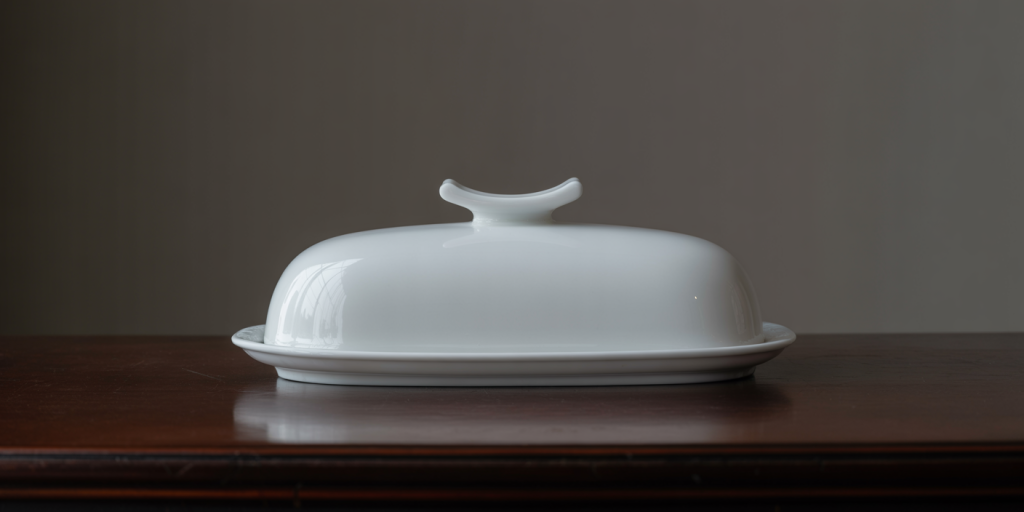 There is nobility in this butter dish — not aristocratic grandeur, but the nobility of function, of form perfected through simplicity. The object does not ask to be looked at, but quietly deserves it. It wears its whiteness like a robe of humility.