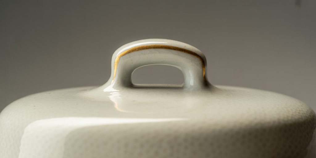 Light is the true protagonist in this composition. It drapes itself across the dish like a silken robe, catching on the lid’s edge, tracing the curve of the dome with delicate reverence. There is no flamboyance in this illumination. It does not boast — it blesses.